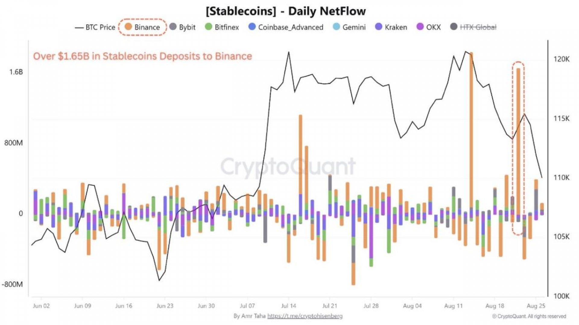 طبق گزارش CryptoQuant، جریان ورودی استیبل‌کوین‌ها به صرافی بایننس به ۱.۶۵ میلیارد دلار رسیده که نشان‌دهنده بازگشت تقاضا برای خرید ارزهای دیجیتال پس از اصلاح اخیر بازار است.