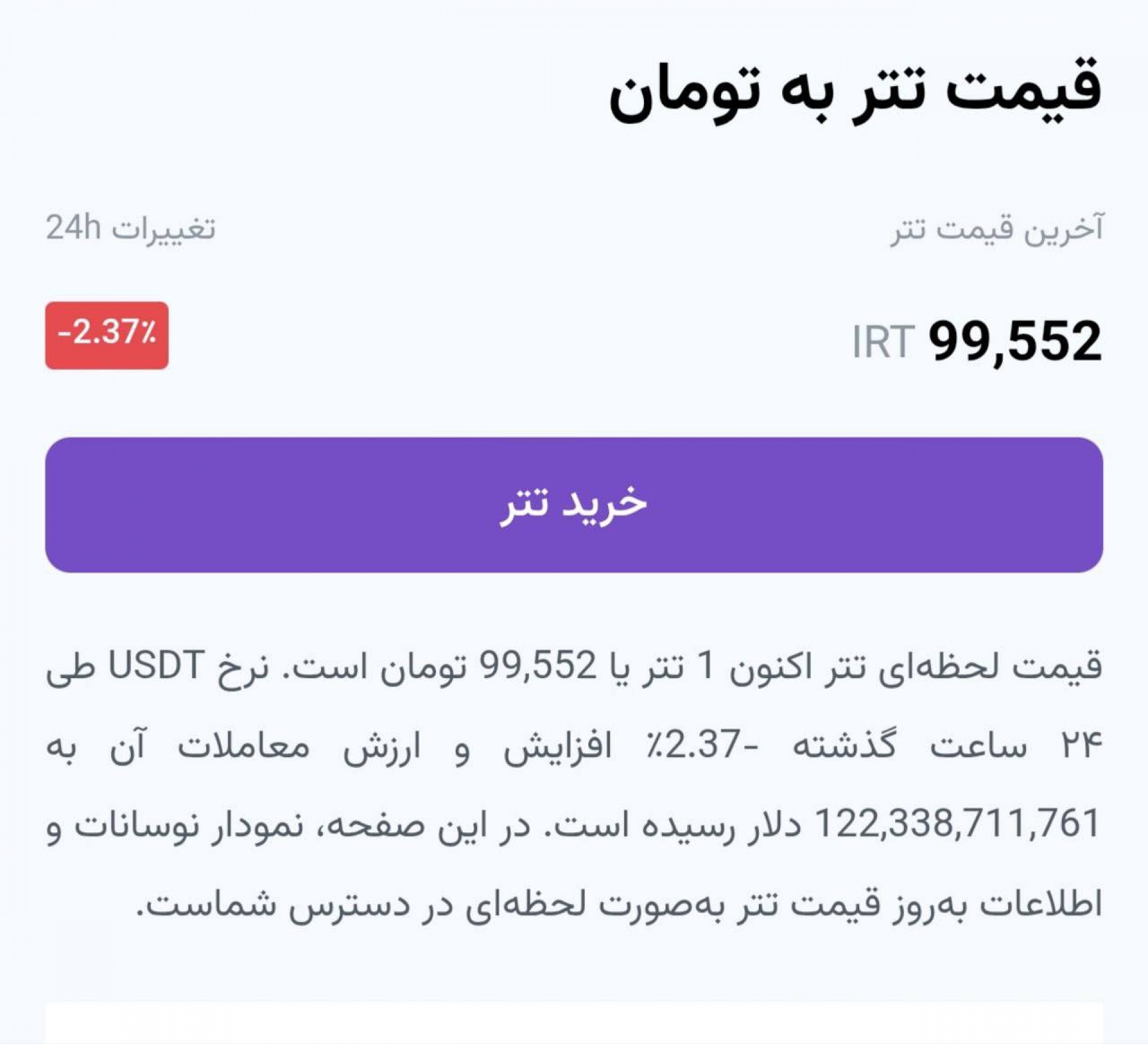قیمت تتر (USDT) در بازار داخلی با افت چشمگیر، به زیر ۱۰۰,۰۰۰ تومان رسید.