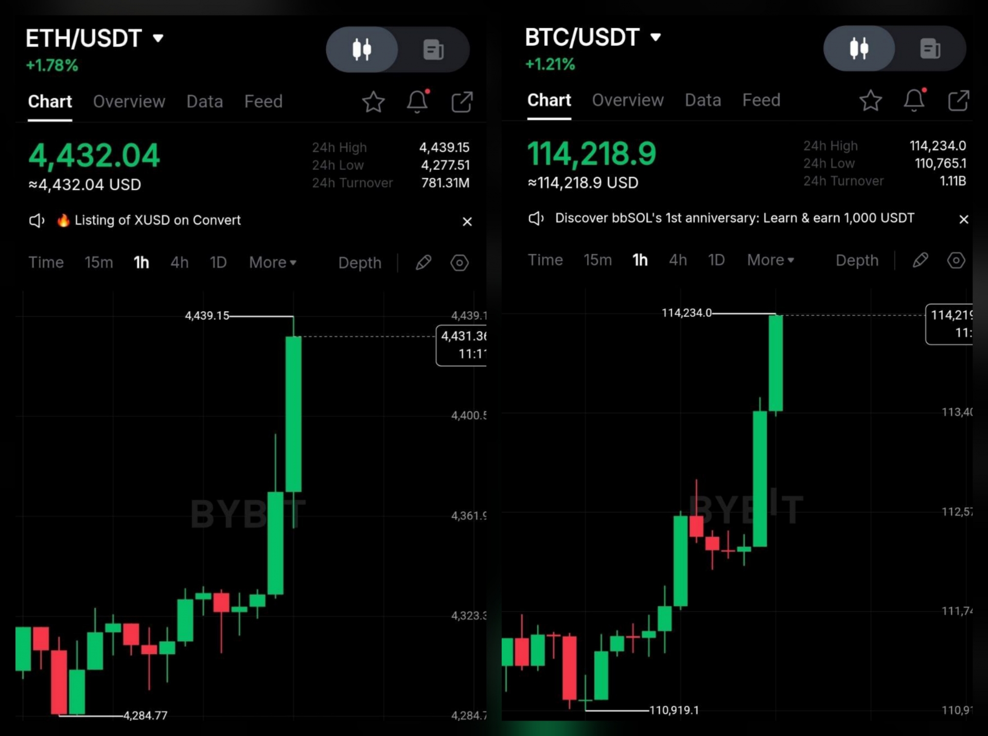 بیت‌کوین (BTC) از سطح ۱۱۴ هزار دلار عبور کرد و اتریوم (ETH) نیز به ۴,۴۳۲ دلار رسید.