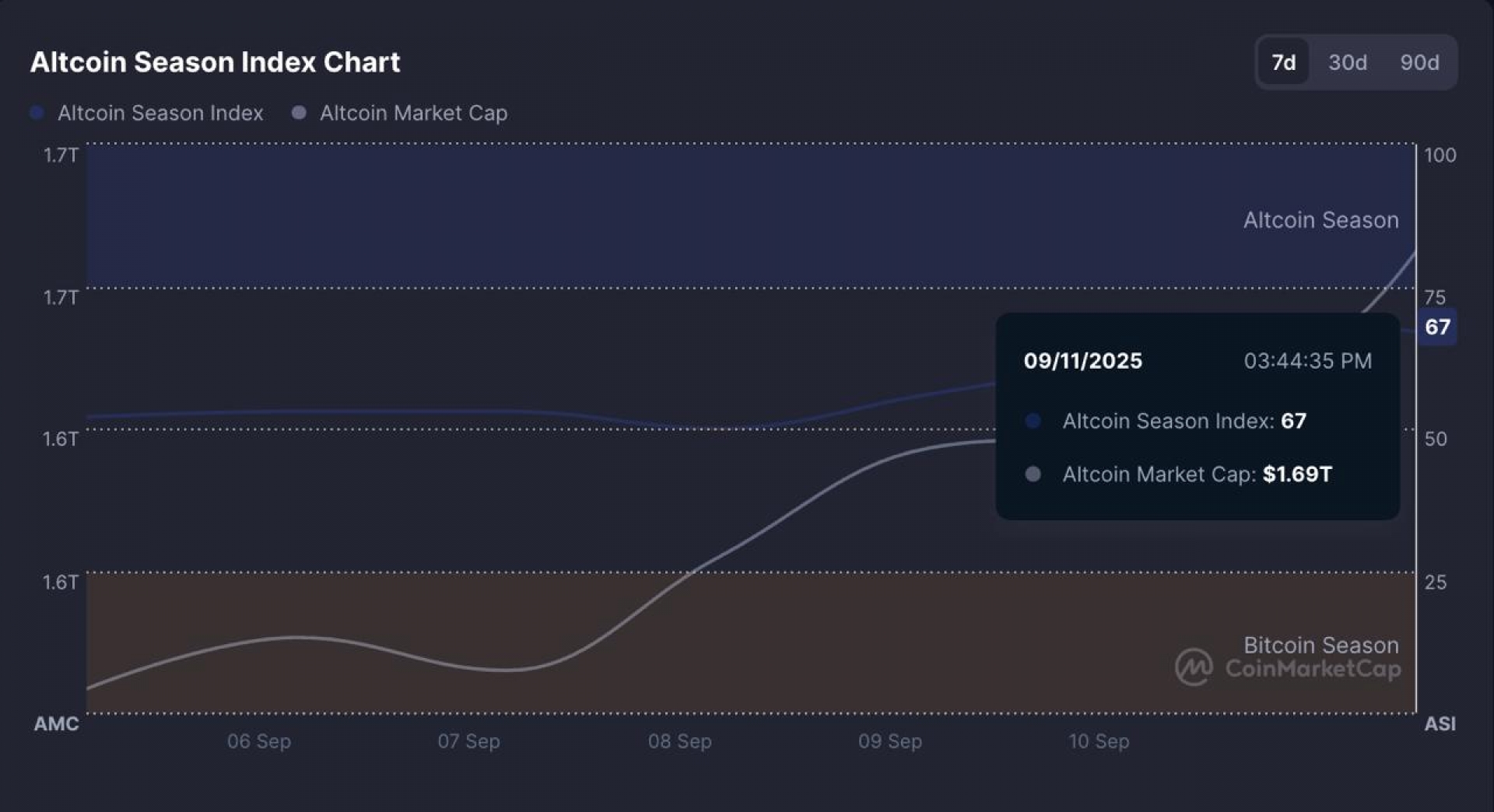 شاخص Altcoin Season از عدد ۲۹ در ماه گذشته به ۶۷ رسیده و نشان‌دهنده قدرت‌گیری بیشتر در بازار آلت‌کوین‌ها است.