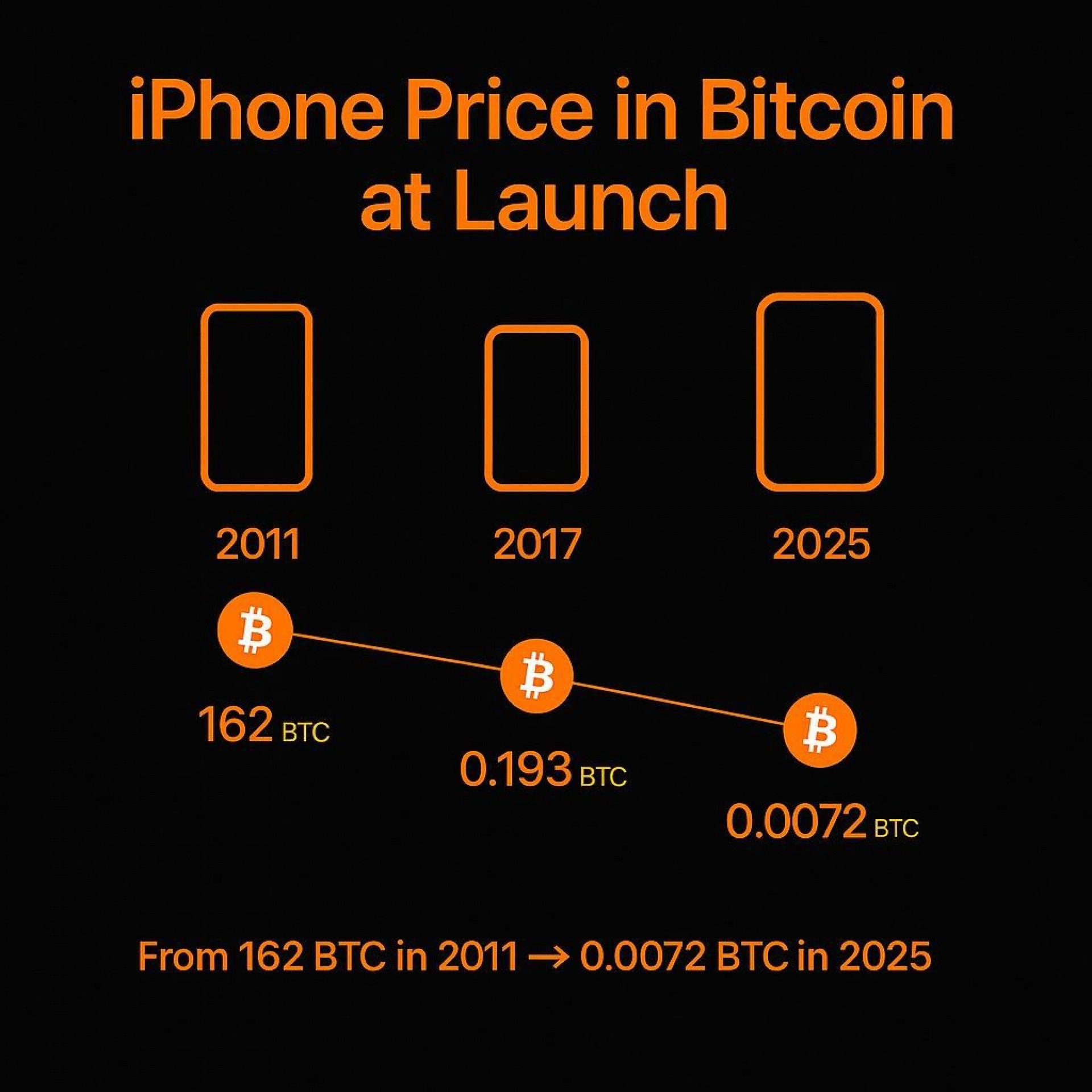 در سال ۲۰۲۵، همان آیفون جدید تنها برابر با ۰.۰۰۷۲ بیت‌کوین قیمت دارد.