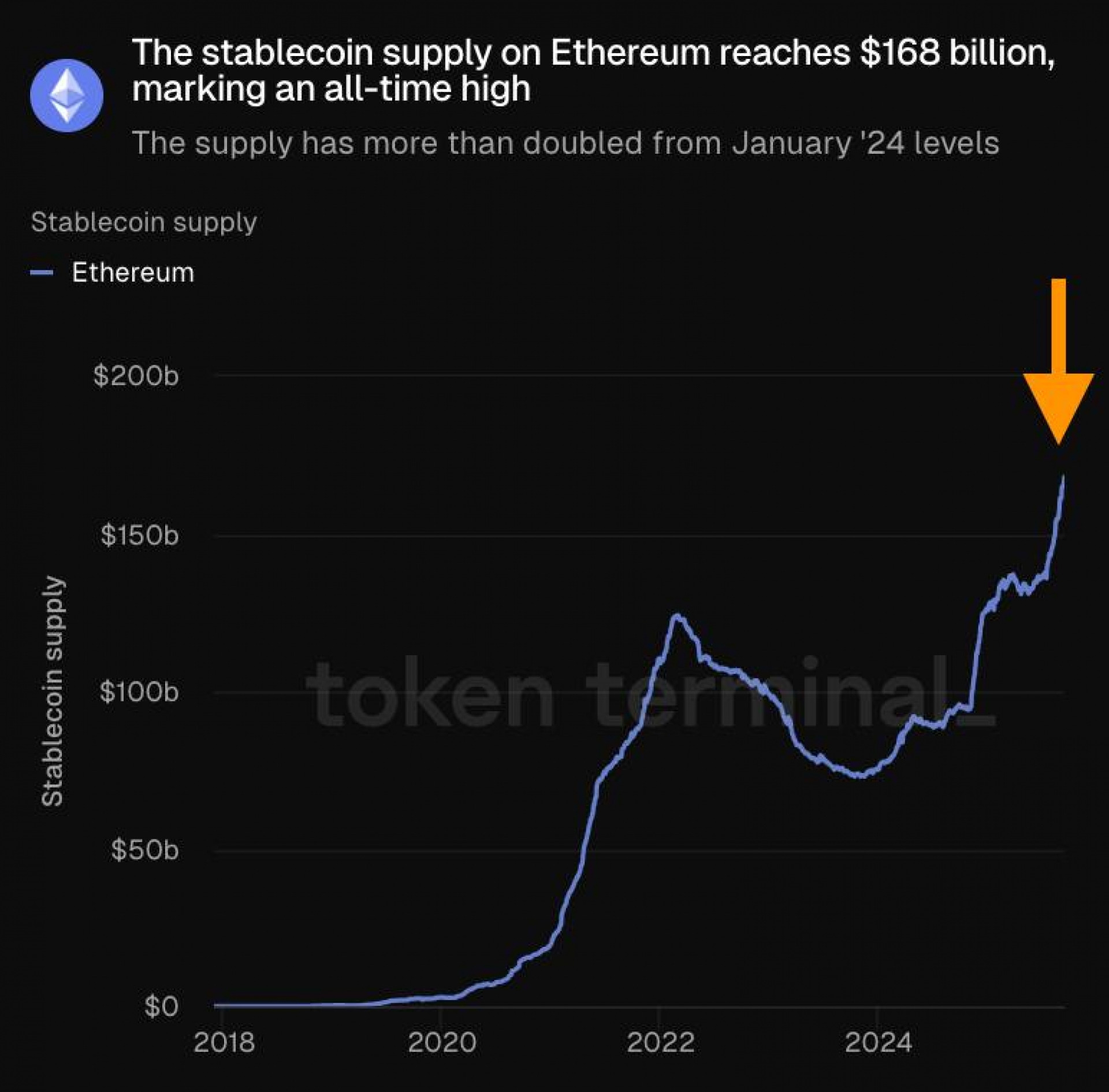 عرضه استیبل‌کوین‌ها در شبکه اتریوم به بالاترین سطح تاریخی خود یعنی ۱۶۸ میلیارد دلار رسیده است.