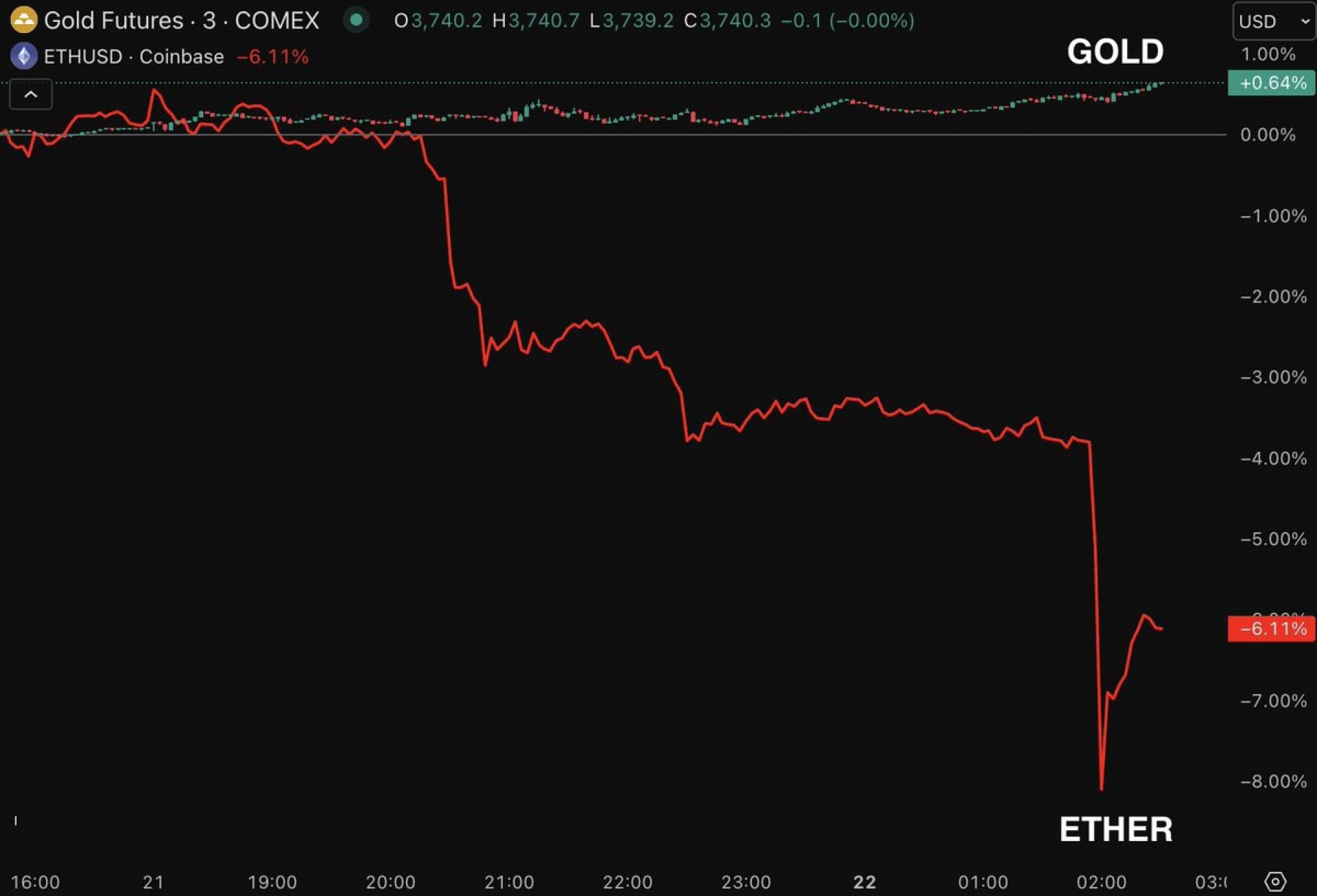 از ساعت ۱۰ شب به وقت آمریکا، طلا و بازار کریپتو در مسیرهای کاملاً متضاد حرکت کردند. در حالی که اتریوم با سقوطی تا منفی ۱۰ درصد همراه شد، طلا روند صعودی خود را ادامه داد و به سمت رکوردهای جدید پیش رفت. این اتفاق یکی از بزرگ‌ترین واگرایی‌ها میان طلا و کریپتو در بیش از ۱۰ هفته اخیر محسوب می‌شود.
