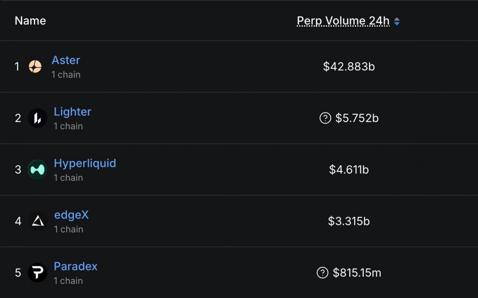 اَستر (Aster) با ثبت حجم معاملات ۲۴ ساعته معادل ۴۲.۸۸ میلیارد دلار در رتبه نخست صرافی‌های پرپچوال قرار گرفت. پس از آن، لایتر (Lighter) با ۵.۷۵ میلیارد دلار و هایپرلیکویید (Hyperliquid) با ۴.۶۱ میلیارد دلار جایگاه‌های بعدی را به خود اختصاص دادند.