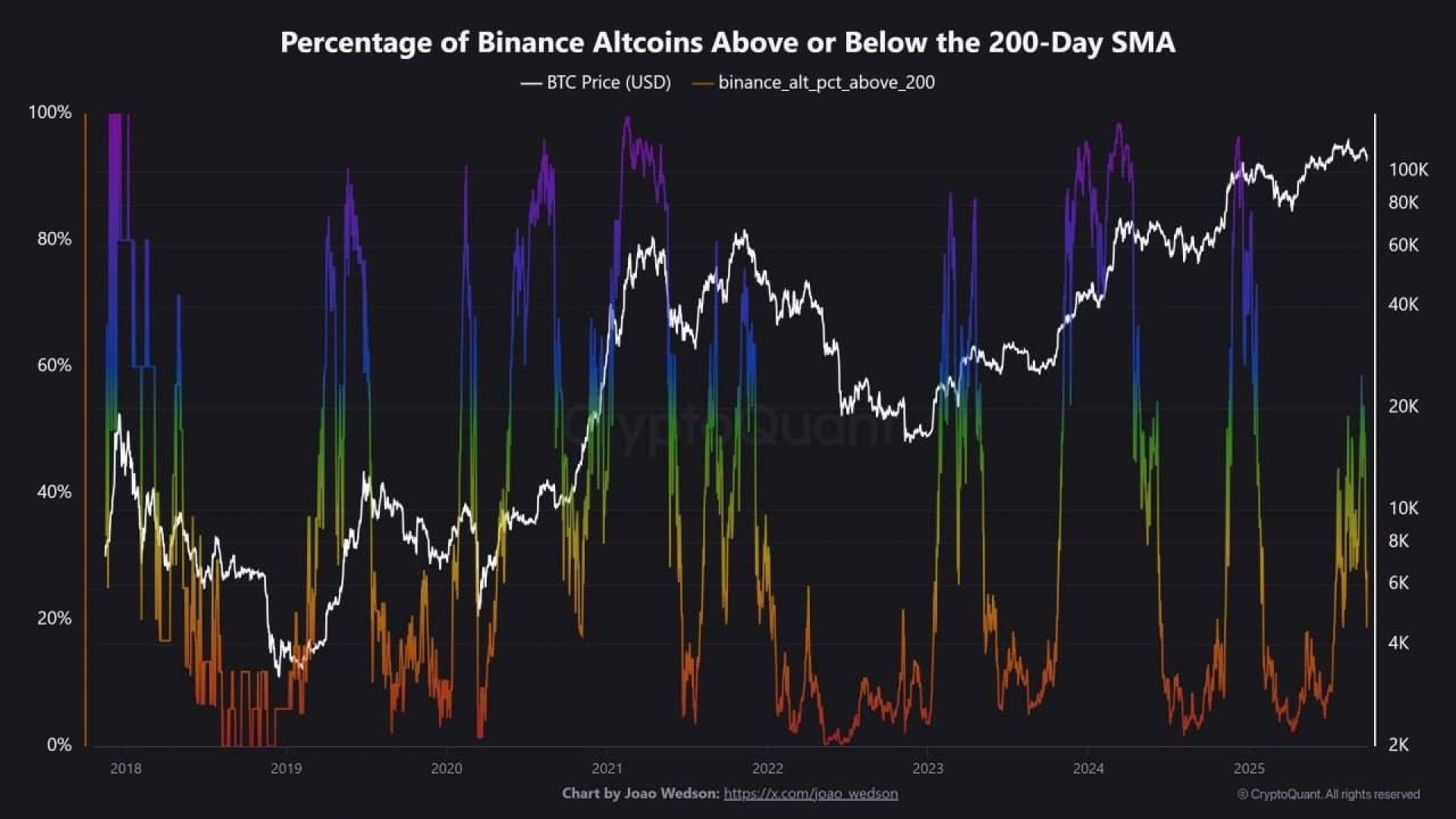 تنها ۲۴٪ آلت‌کوین‌های بایننس بالای میانگین ۲۰۰ روزه قرار دارند؛ نشانه‌ای که می‌تواند یکی از بهترین فرصت‌ها برای انباشت پیش از حرکت صعودی بعدی باشد.