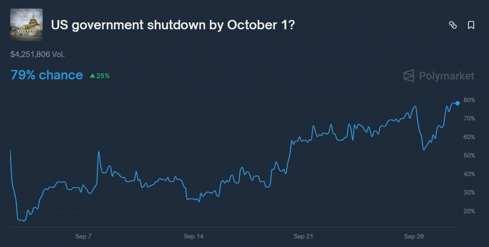 آخرین داده‌ها نشان می‌دهد که شانس تعطیلی دولت ایالات متحده تا فردا به ۷۹ درصد رسیده است. این وضعیت می‌تواند باعث افزایش نوسانات شدید در روزهای آینده شود.