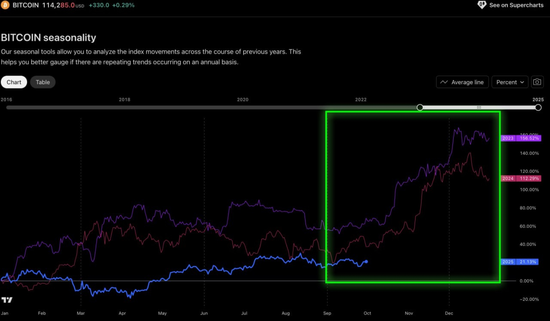 داده‌های تاریخی نشان می‌دهد که فصل چهارم (Q4) همواره برای بیت‌کوین و بازار کریپتو روندی صعودی داشته است. تحلیل‌گران تأکید می‌کنند امسال نیز تفاوتی نخواهد داشت و بازار از این الگو پیروی خواهد کرد.