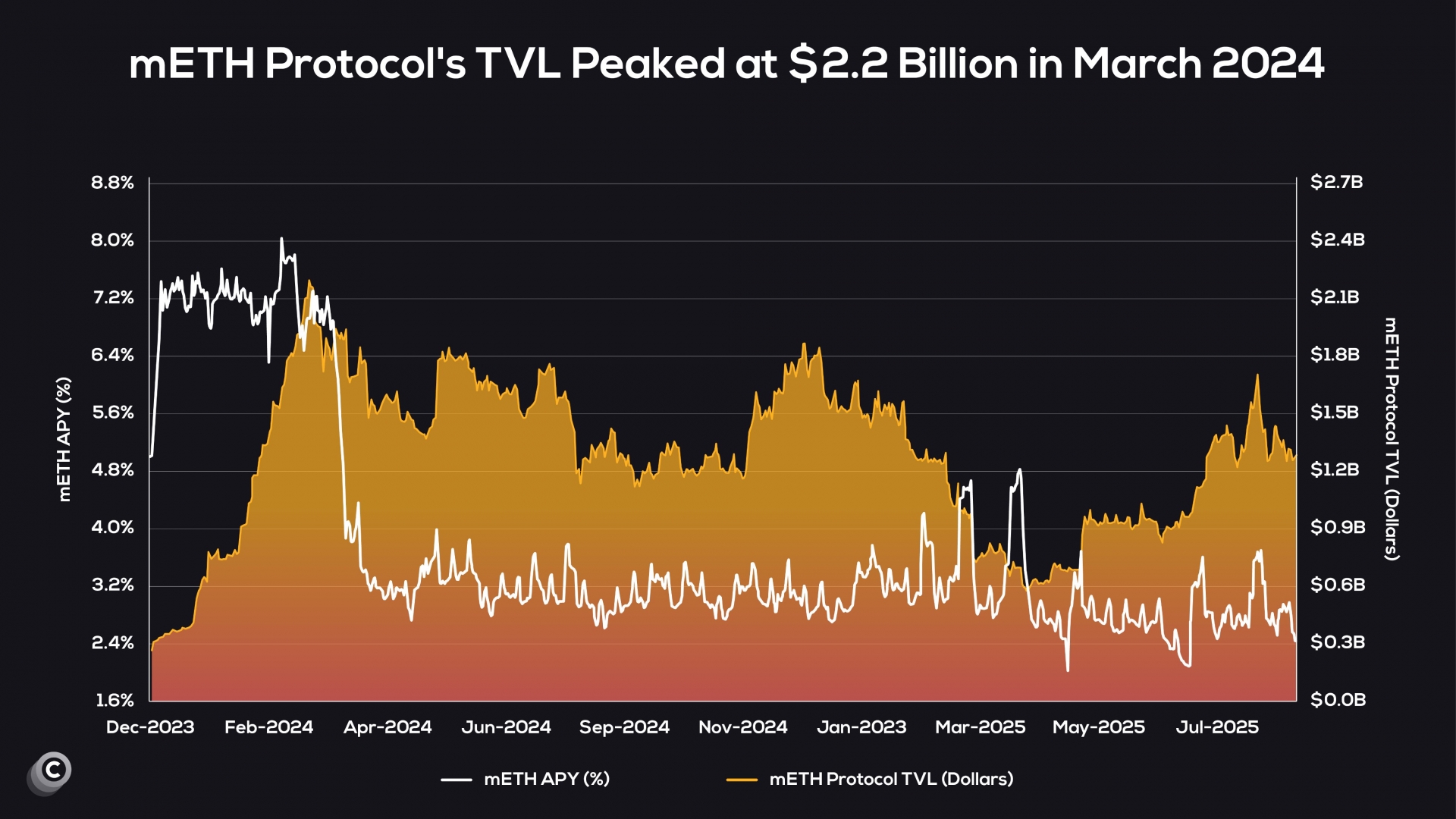 پروتکل mETH که در دسامبر ۲۰۲۳ به‌طور عمومی راه‌اندازی شد، در مارس ۲۰۲۴ به اوج ارزش قفل‌شده (TVL) معادل ۲.۱۹ میلیارد دلار رسید. اگرچه اکنون این رقم به ۱.۲۷ میلیارد دلار کاهش یافته است، اما این پروتکل همچنان خود را به‌عنوان یک زیرساخت مقیاس‌پذیر و قابل اعتماد برای بلندمدت اثبات کرده است.