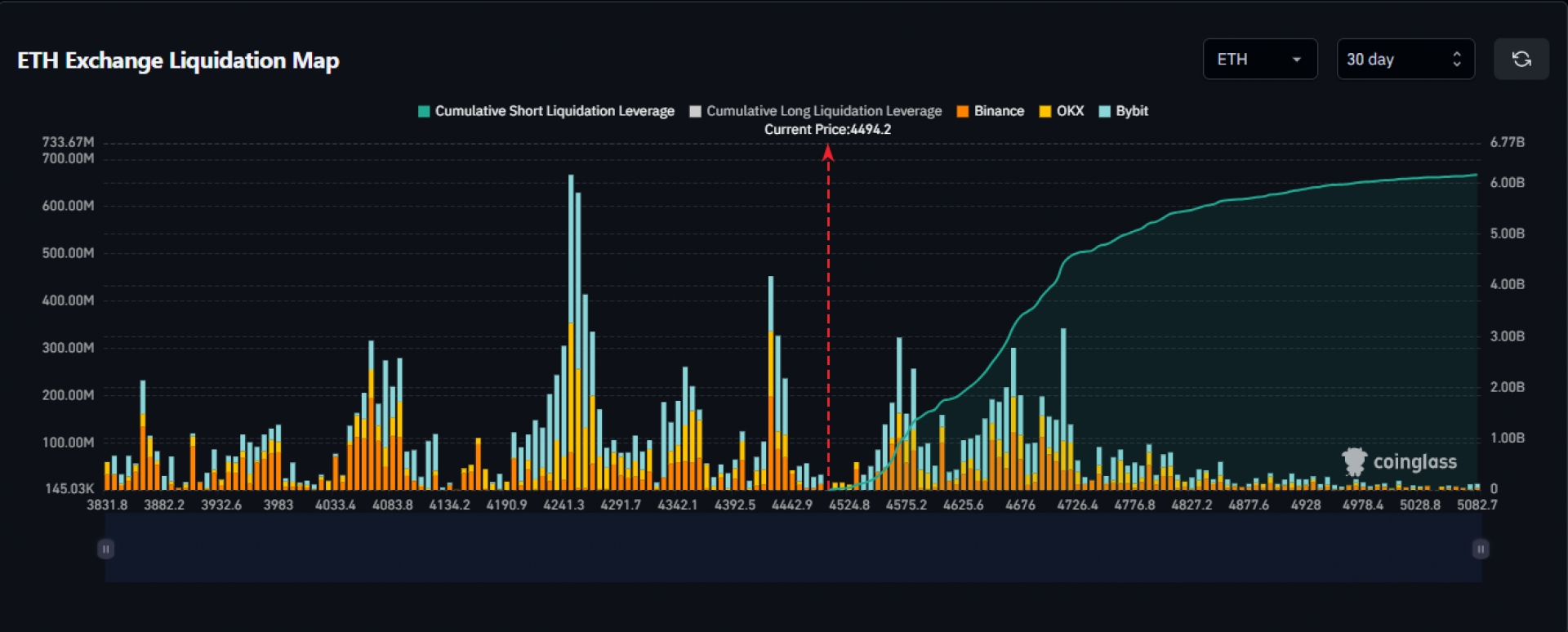 در صورت عبور قیمت اتریوم از سطح ۵۰۰۰ دلار، موقعیت‌های شورت به ارزش ۶ میلیارد دلار در بازار لیکوئید خواهند شد.