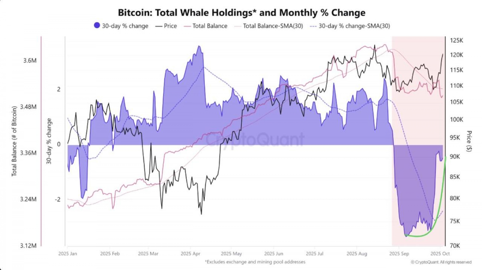 طبق داده‌های CryptoQuant، فشار فروش نهنگ‌ها در حال کاهش است که می‌تواند نشانه‌ای از شروع فاز انباشت مجدد در بازار باشد. این تغییر رفتار معمولاً پیش از دوره‌های صعودی بزرگ مشاهده می‌شود.