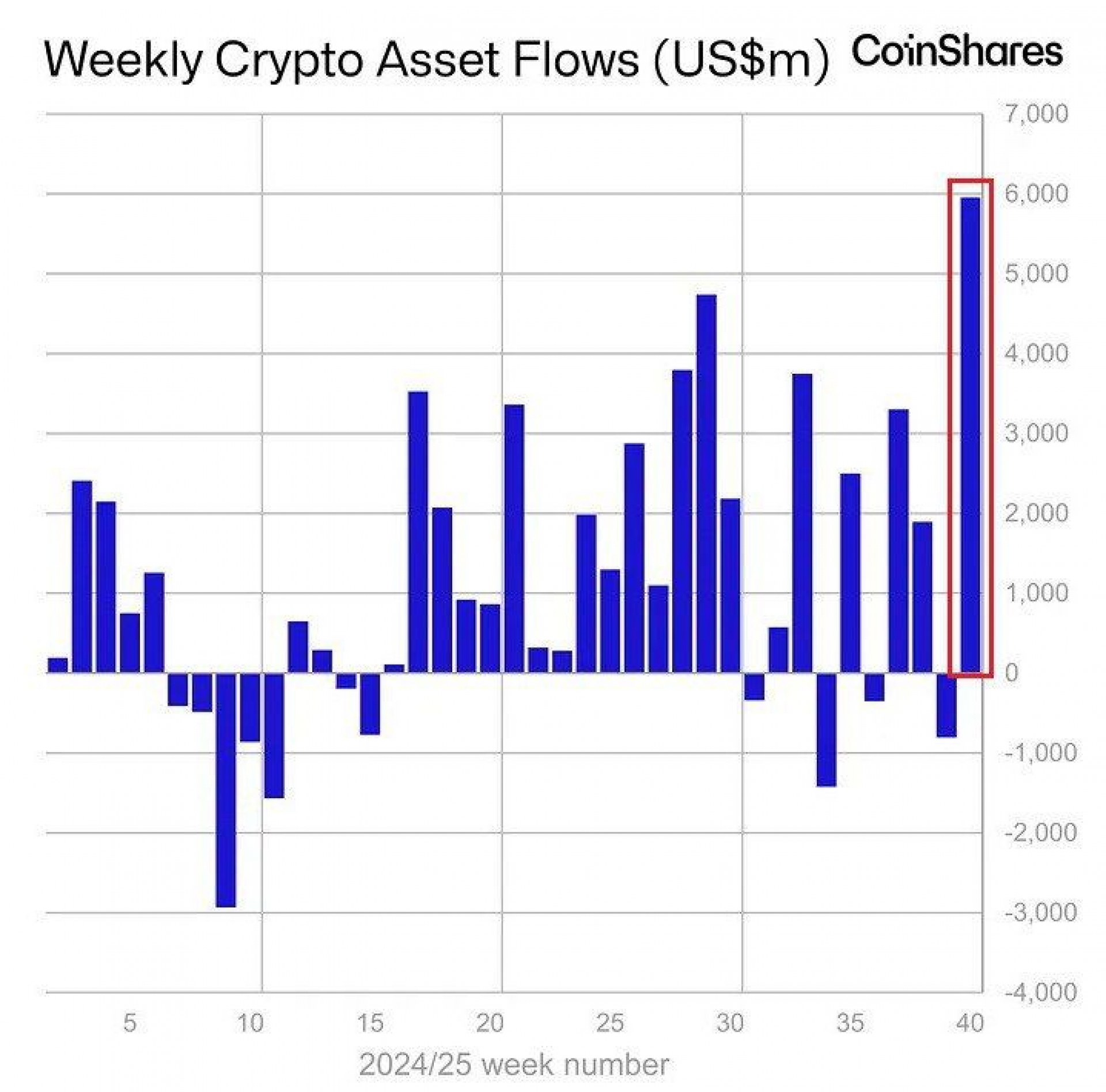 صندوق‌های کریپتو هفته گذشته با ورود ۵.۹۵ میلیارد دلار سرمایه، رکورد تاریخی ثبت کردند.
