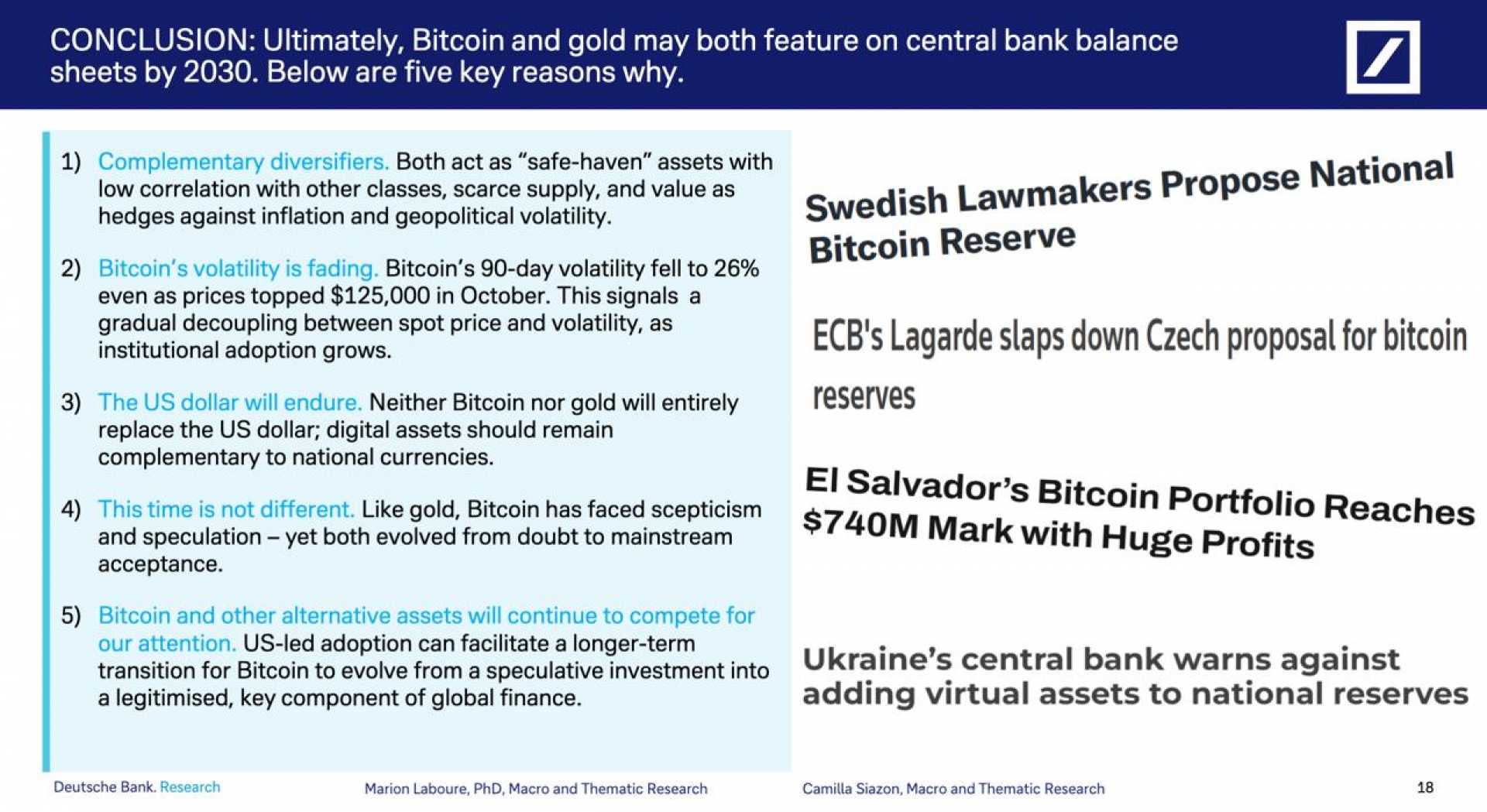 دویچه بانک اعلام کرد که تا سال ۲۰۳۰ احتمال دارد بیت‌کوین و طلا در ترازنامه بانک‌های مرکزی قرار گیرند.