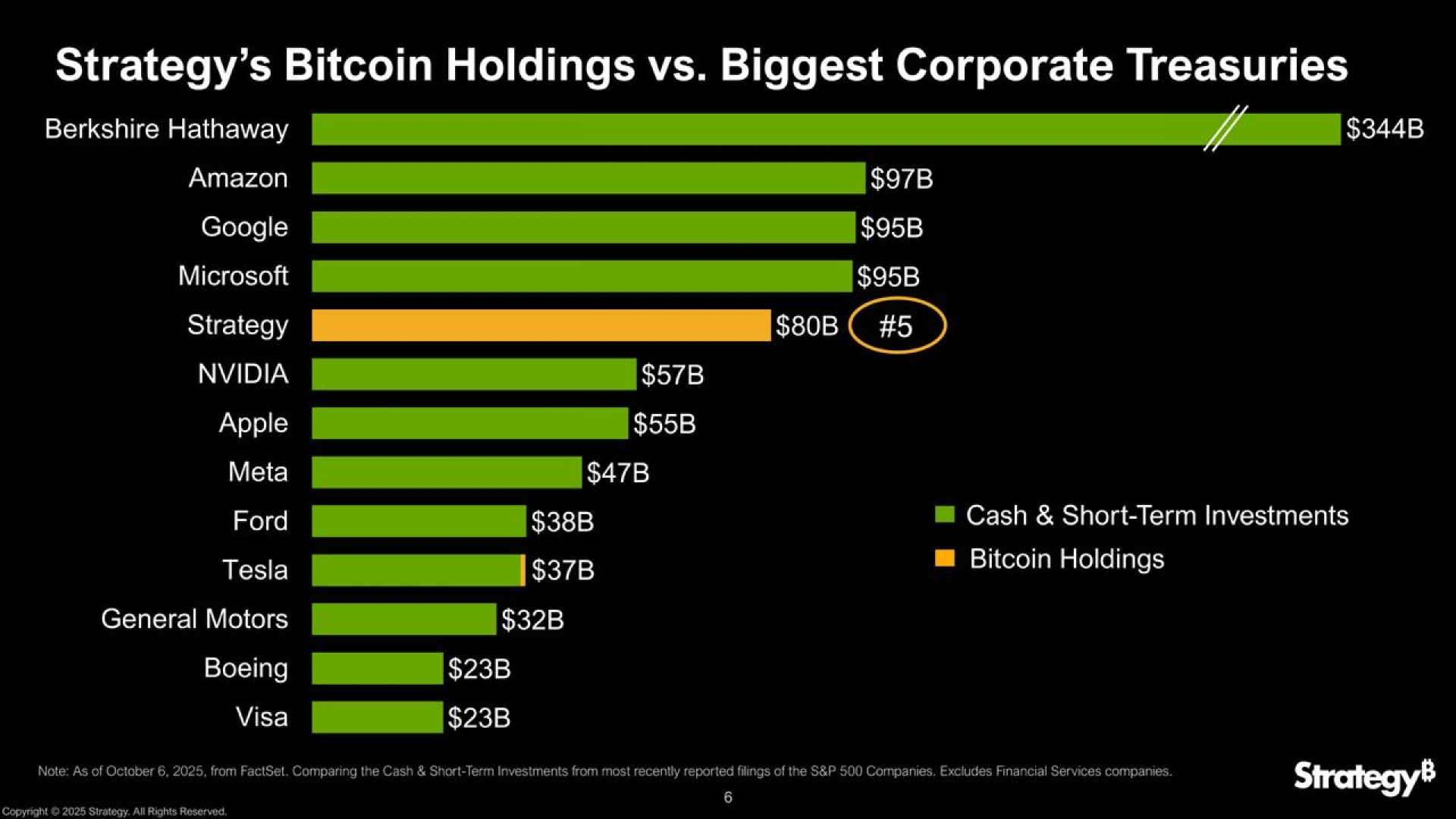 شرکت استراتژی مایکل سیلور اکنون نزدیک به ۸۰ میلیارد دلار بیت‌کوین در اختیار دارد — رقمی که آن را در کنار ذخایر نقدی آمازون، گوگل و مایکروسافت قرار می‌دهد و به پنجمین خزانه شرکتی بزرگ در میان شرکت‌های S&P 500 تبدیل کرده است.