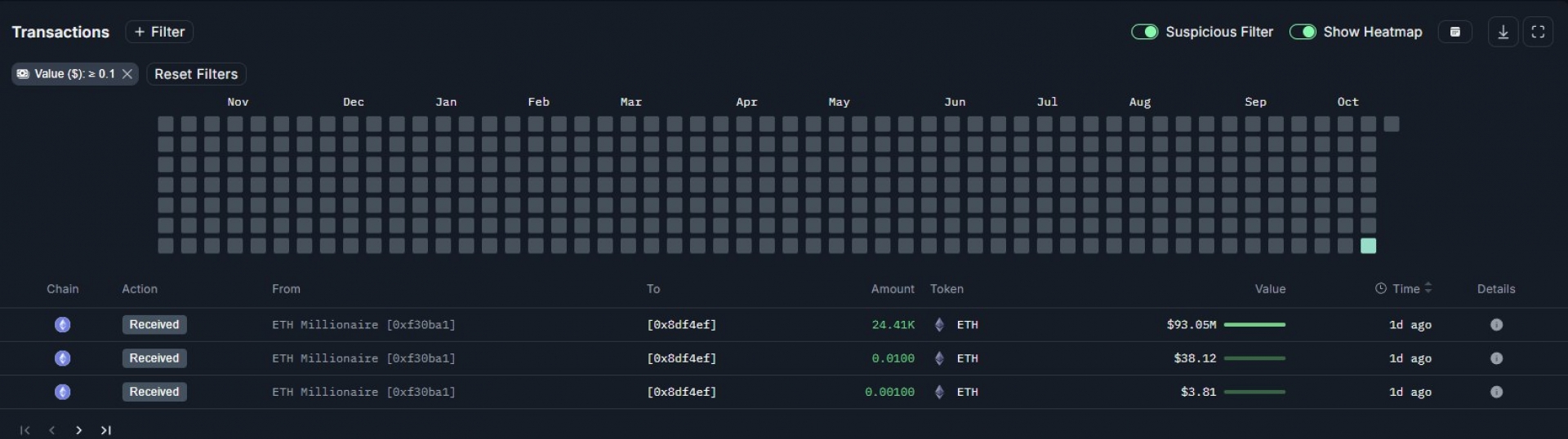 یک کیف پول تازه تأسیس ۲۴,۴۰۰ واحد اتریوم به ارزش تقریبی ۹۳ میلیون دلار دریافت کرد، که می‌تواند نشان‌دهنده حرکت سرمایه نهادی یا سرمایه‌گذاری عمده در بازار باشد.
