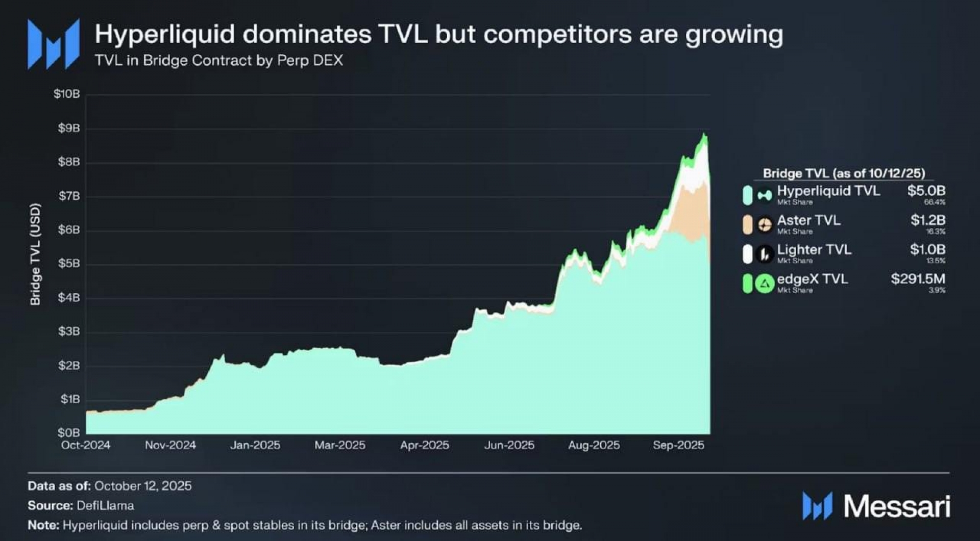 داده‌های تازه نشان می‌دهد ارزش قفل‌شده (TVL) در پلتفرم معاملاتی دائمی هایپرلیکویید (Hyperliquid) به رقم چشمگیر ۵ میلیارد دلار رسیده است. در همین حال، پروژه Aster نیز با ۶۵۵ میلیون دلار TVL در رتبه بعدی قرار دارد و پیش‌تر تا نزدیکی ۲ میلیارد دلار اوج گرفته بود.