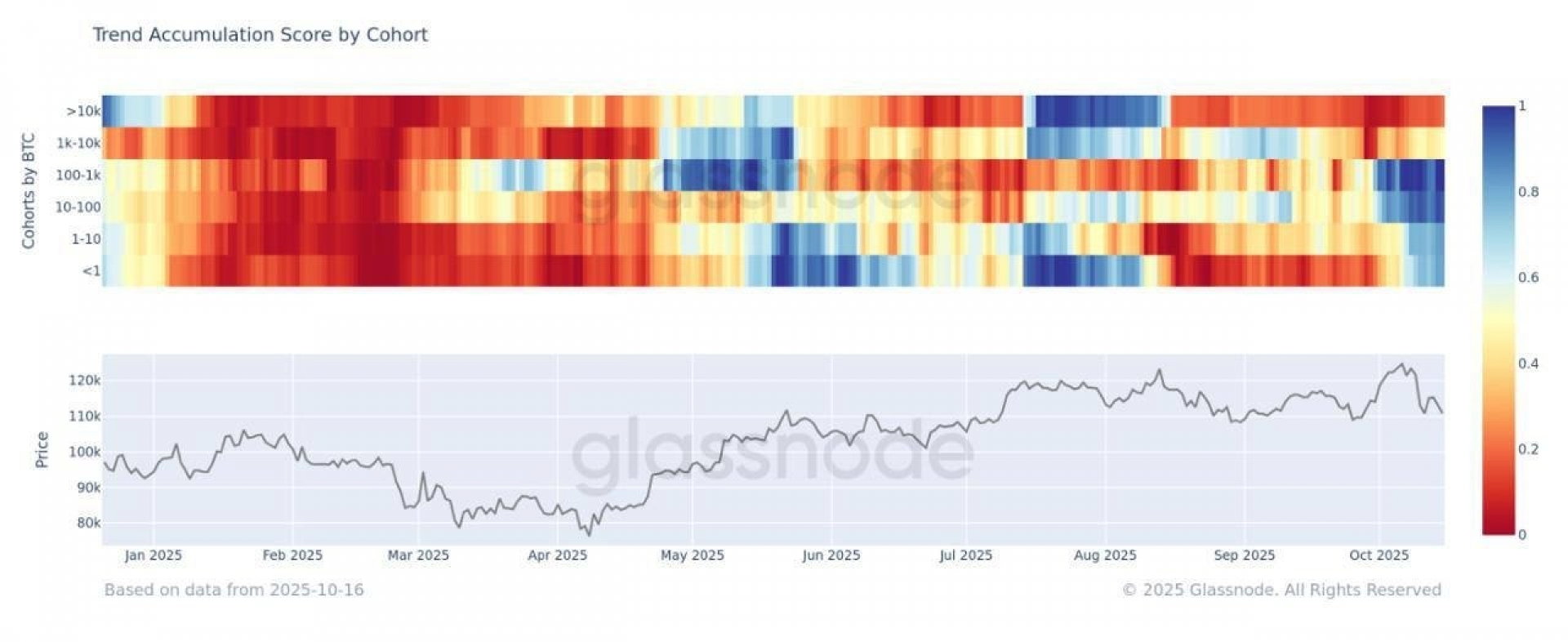 داده‌های آن‌چین نشان می‌دهد گروه‌های کوچک تا متوسط ​​(دارندگان بین ۱ تا ۱۰۰۰ بیت‌کوین) به‌صورت پیوسته در حال انباشت هستند، در حالی که نهنگ‌ها توزیع خود را کند کرده‌اند. این روند با وجود نوسانات اخیر، نشانه‌ای از بازگشت اعتماد سرمایه‌گذاران خرد به بازار است.