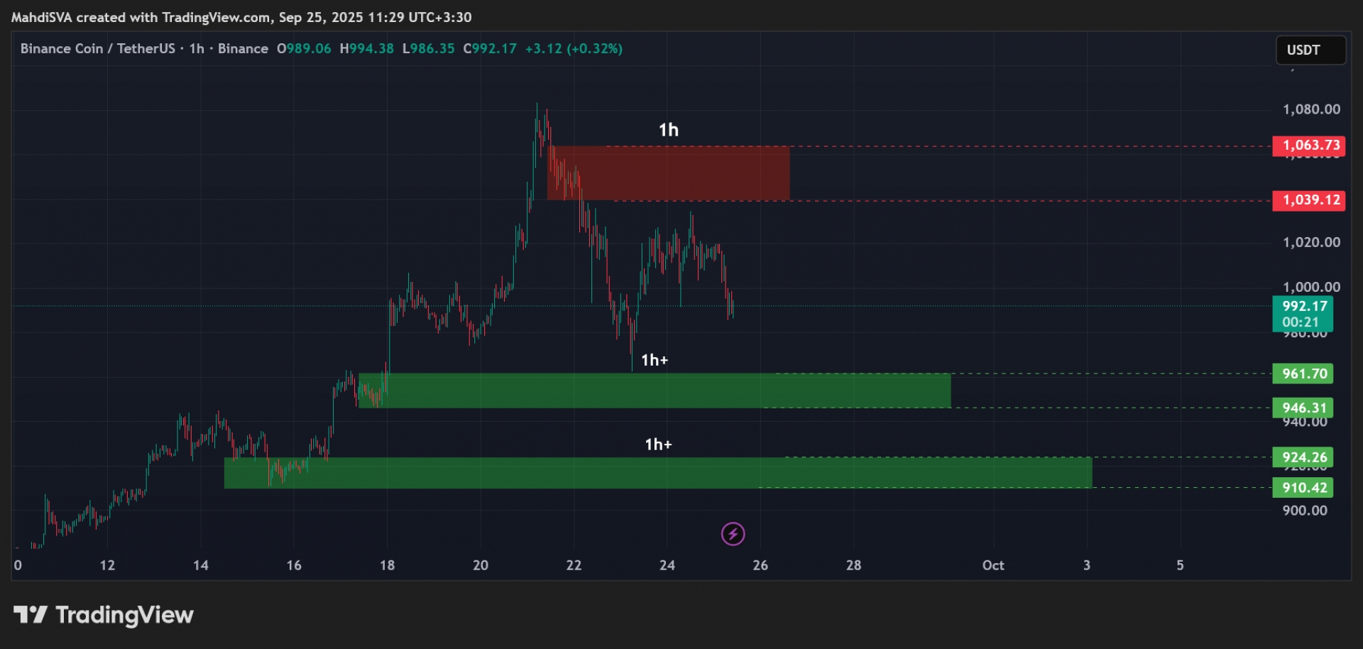 بایننس کوین بعد از ثبت سقف تاریخی جدید هنوز فشار فروش و عرضه خاصی را نشان نمی‌دهد. دو محدوده حمایتی 1 ساعته برای این رمزارز وجود دارد: 910-924 و 946-961. مقاومت پیش روی قیمت نیز محدوده 1039-1063است. با توجه به این شرایط، اگر وضعیت بیت کوین کمی بهبود یابد، قیمت می تواند حتی از سقف تاریخی خود عبور کند