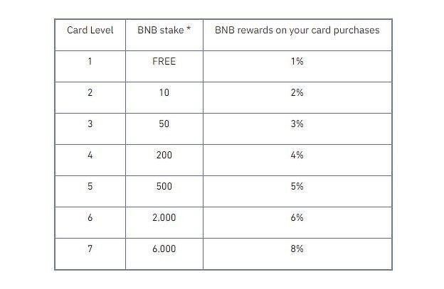 برای رسیدن به پاداش 8 درصدی کامل باید حداقل 6 هزار BNB در والت خودتان داشته باشید که در حال حاضر ارزش آن معادل با 250 هزار دلار است. برای کارت سطح دو که 2 درصد تخفیف دارد نیاز به 10 BNB یا به عبارتی حدود 420 دلار دارید.