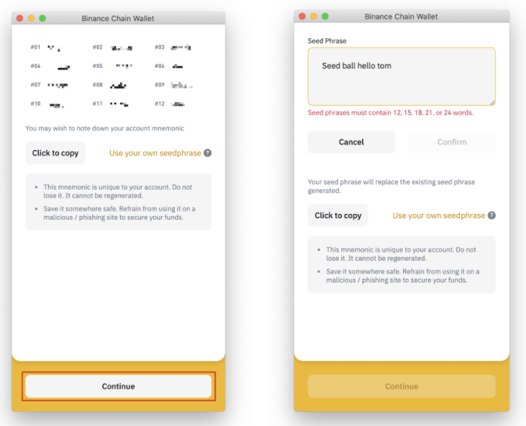 - پس از مطمئن شدن از ذخیره عبارت یادآور به صورت امن، روی continue کلیک کنید.