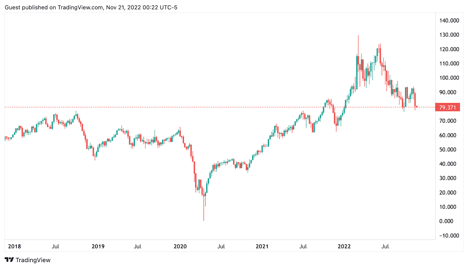 نمودارهای USOIL - قیمت نفت در سال 2022 به طور چشمگیری افزایش پیدا شد که این موضوع همزمان شد با ریزش قیمت ارزهای دیجیتال (همانطور که در نمودار زیر مشاهده میکنید).