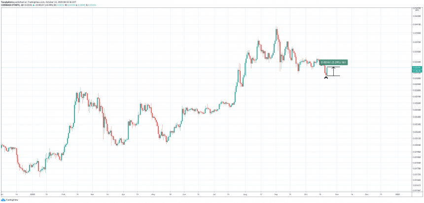 عملکرد بهتر Ethereum از بیت کوین در جفت دلار همچنین می تواند در نسبت دو نفره منعکس شود .در جفت معاملات ETH وBTC اتریوم همچنین بیش از 5٪ در روز در برابر دارایی ارز دیجیتال پیشرو با سقف بازار سود کسب کرده است