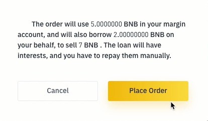 حالا اگر تصمیم بگیرید 7 BNB را Margin Sell کنید، سیستم به صورت خودکار برای شما 2 BNB قرض میگیرد (توجه کنید که موجودی واقعی شما 5 BNB است).