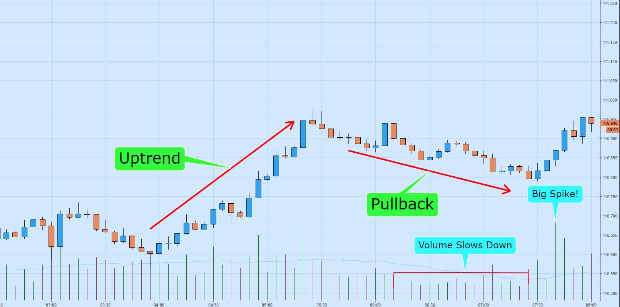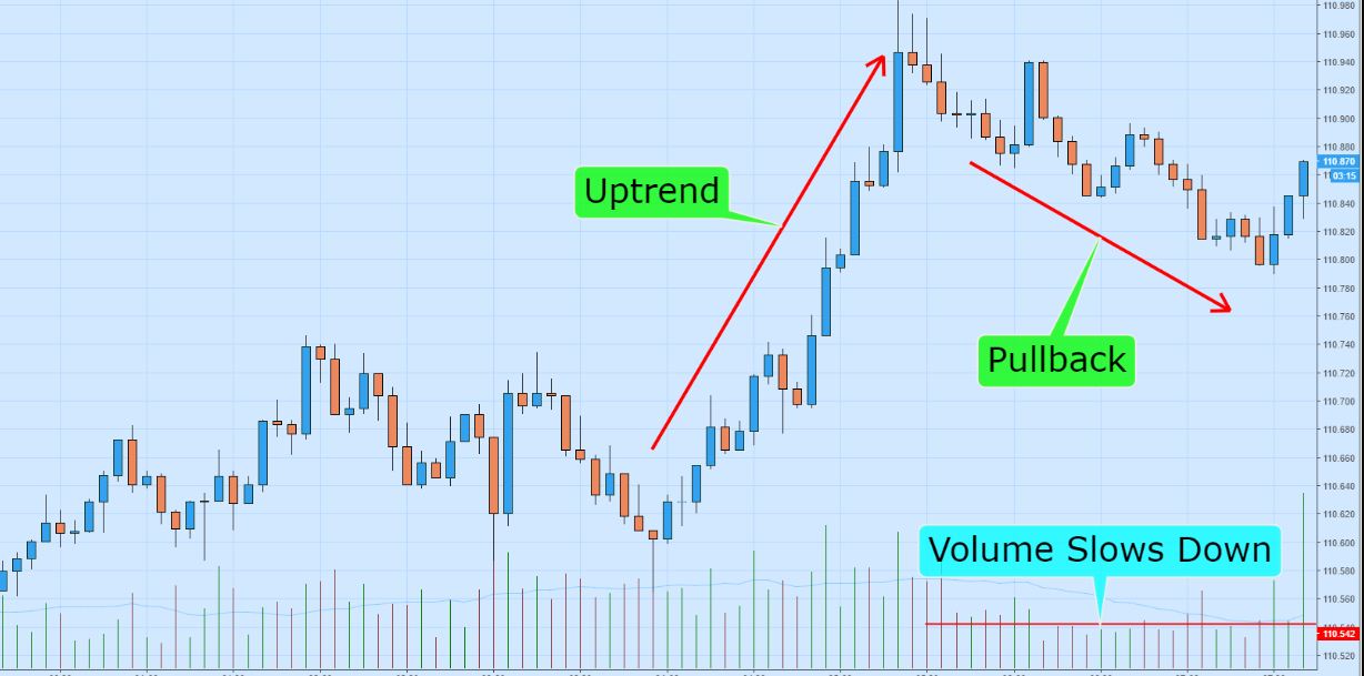 مرحله سوم: یک روند صعودی یا ریزشی سالم را پیدا کنید. پول بک پرایس اکشن را شناسایی کرده و صبر کنید تا حجم کاهش پیدا کند.