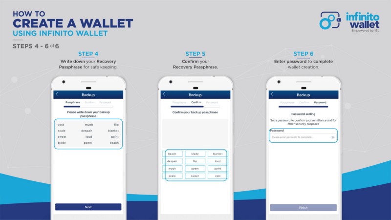 در اینجا، یک کلمه عبور 12 کلمه ای، همچنین به عنوان یک seed شناخته می شود. این عبارات برای بازگرداندن کیف پول شما در صورت از دست دادن تلفن خود و یا فراموش کردن رمز عبور خود می باشد، بنابراین آن را در جای امن نگه دارید! ما توصیه می کنیم آن را بنویسید و آن را در جایی امن دور از دسترس افراد ذخیره کنید. هنگامی که عبارت عبور خود را نوشته اید، کلمات را باید صحیح تایپ کنیدو در نهایت رمز عبور مناسب را برای ورود به کیف پول خود قرار دهید و برای تکمیل فرایند روی «finish» کلیک کنید.