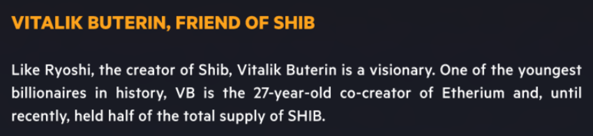 در مقاله سفید پروژه نقل قولی از Ryoshi وجود دارد که میگوید: "ما 50 درصد از موجودی کل را برای ویتالیک ارسال کردیم؛ هیچ عظمتی بدون آسیب پذیری وجود ندارد و اگر ویتالیک بوترین از ما حمایت کند، شیبا رشد و پیشرفت خواهد داشت."